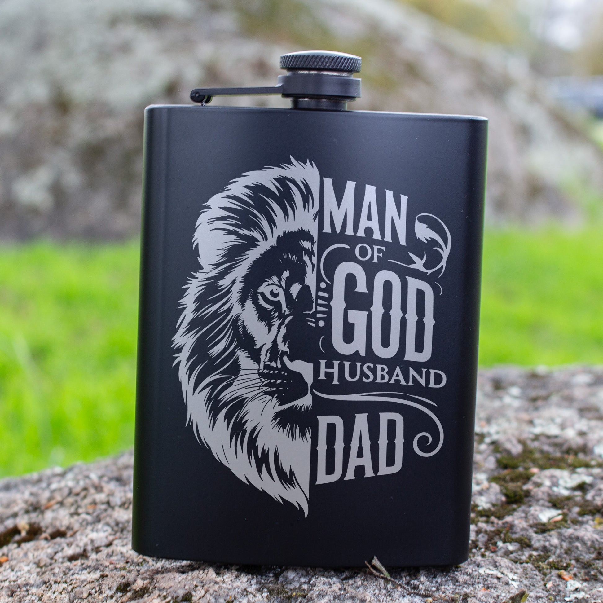 Bless the "Man Of God, Husband, Dad" with this engraved flask—order now and give him a keepsake as enduring as his devotion!